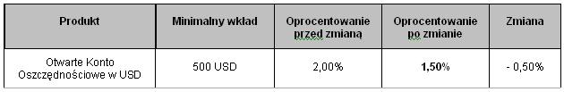 ING Bank Śląski podjął decyzję o obniżeniu oprocentowania Otwartego Konta Oszczędnościowego prowadzonego w USD o 0,50 pkt. proc. dla klientów indywidualnych i małych firm. Nowe stawki obowiązują od 1 października b.r.