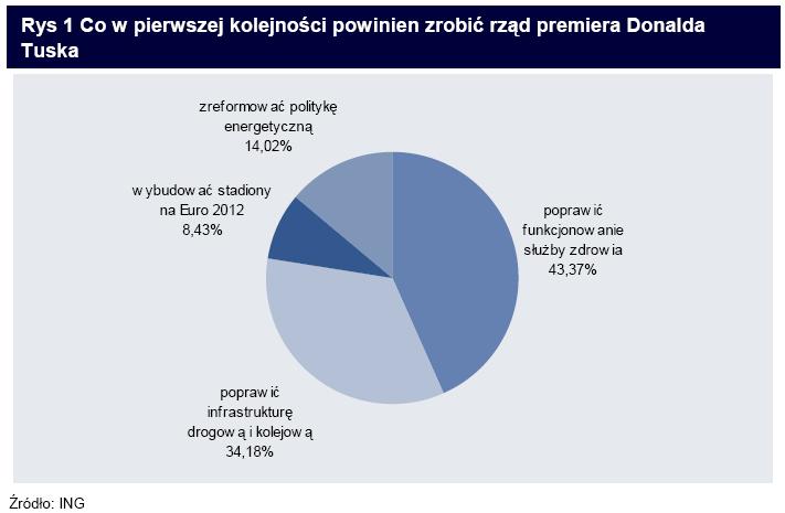 W ankiecie, którą w dniach 20 – 27 października przeprowadziliśmy na stronie ING BankOnLine, odpowiedzi udzieliło ponad 18 tys. osób. Na pytanie „Co w pierwszej kolejności powinien zrobić rząd premiera Donalda Tuska”, 43% respondentów odpowiedziało, że najważniejsze jest zapewnienie sprawniejszego funkcjonowania systemu publicznej opieki zdrowotnej, 34% przyznało palmę pierwszeństwa poprawie infrastruktury drogowej i kolejowej, a 14% za priorytet uznało reformę polityki energetycznej. Wreszcie 8% badanych chciałoby, aby pierwszoplanowym zadaniem dla rządu była budowa stadionów na Euro 2012.