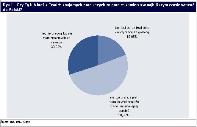 W ankiecie, którą w dniach 3 listopada – 10 listopada przeprowadziliśmy na stronie ING BankOnLine, zadaliśmy pytanie „Czy Ty lub ktoś z Twoich znajomych pracujących za granicą zamierza w najbliższym czasie wracać do Polski?” Odpowiedzi udzieliło ponad 15 tys. naszych Klientów, z czego 19% z nich widzi możliwości powrotu (własnego lub znajomych) do kraju z uwagi na pogarszające się warunki zarobkowania za granicą, podczas gdy 51% uznała, że warunki ekonomiczne są wciąż korzystniejsze w krajach emigracji niż w ojczyźnie.