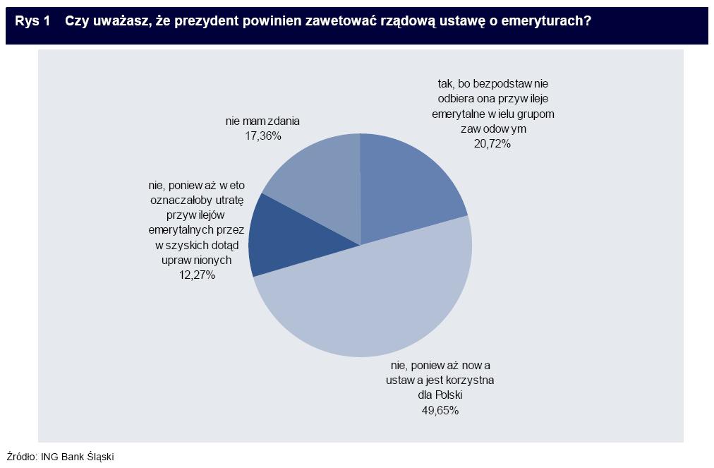 Co druga osoba, która wzięła udział w ankiecie ING, zagłosowała na niejednoznaczną odpowiedź „nowa ustawa (o przywilejach emerytalnych) jest korzystna dla Polski”. Jak mogli zinterpretować ją nasi Klienci? Ekonomia pozytywna posługuje się w takich sytuacjach pojęciem efektywności w sensie Pareto i ocenia czy dane rozwiązanie spełnia dwa warunki: czy nikomu nie szkodzi i czy poprawia czyjąś sytuację. Jeśli więc nasi klienci rozpatrywali nasze pytanie w sensie Pareto, to stając przed alternatywą „prezydent nie zawetuje ustawy i wiele osób straci przywileje”, a „prezydent zawetuje ustawę i wszyscy stracą przywileje” powinni się skłonić ku pierwszej odpowiedzi.