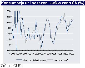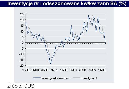 PKB wzrósł o 4,8%r/r w 3kw po 5,8% poprzednio. Chociaż to więcej niż się spodziewaliśmy (naszą prognozą było 4,4% przy konsensusie rynkowym 4,6%) to w danych widzimy niepokojące sygnały. O ile konsumpcja utrzymała dobre wyniki (wzrost o 5% to wciąż więcej niż średnio w 2007), inwestycje doznały poważnego uszczerbku odnotowując ujemny wzrost w ujęciu kw/kw dla danych odsezonowanych (po zannualizowaniu -2%, spadek z 8,7% w 2kw) i chociaż w ujęciu r/r widać wciąż 3,5% wzrostu to kolejne kwartały mogą być o wiele gorsze. To co sprawiło, że wzrost gospodarczy nie ucierpiał na załamaniu inwestycji to łączny wpływ wyhamowania importu (w ślad za inwestycjami; eksport netto dodał do wzrostu 0,2 pkt. proc po -0,4 w 2kw) i zwiększenia zapasów (wpływ na wzrost o 0,6 pkt. proc., ten efekt powinien szybko zostać wyeliminowany przez zamykanie bądź redukowanie produkcji w przedsiębiorstwach).