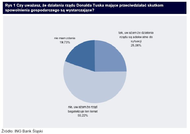W ankiecie ING zadaliśmy pytanie, czy gabinet Donalda Tuska podejmuje wystarczające działania przeciwdziałające skutkom spowolnienia gospodarczego. Ponad co drugi ankietowany klient ING uznał, że rząd bagatelizuje ten problem i za mało się stara przeciwdziałać jego skutkom. W badaniu przeprowadzonym na stronach ING BankOnLine udzielono ponad 15 tysięcy odpowiedzi.