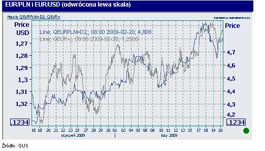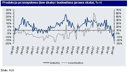Produkcja w styczniu (-14,9%) okazała się jeszcze gorsza od złych oczekiwań (-11,4% r/r), także po odsezonowaniu (12,7%) osiągnęliśmy najgorszy wynik przynajmniej od 1994 roku. Spadek eksportu jest prawdopodobnie głównym czynnikiem działającym przeciw polskiemu przemysłowi. Wysoka baza początku 2008 oraz bijące rekordy słabości wskaźniki bieżącej aktywności gospodarczej w strefie euro zapowiadają kontynuację kiepskich wyników w następnych miesiącach (może z wyjątkiem marca, w którym nie ma w tym roku Wielkanocy). Niespodzianką jest 7% wzrost sprzedaży w budownictwie (która powinna być pod dużą presją związaną z pogodą).