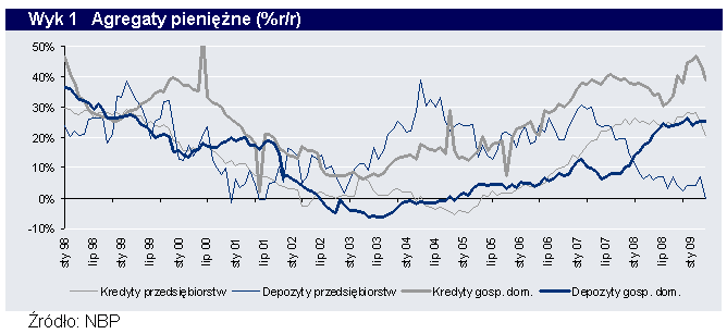 Agregaty pieniężne wykazały w kwietniu spowolnienie w ujęciu r/r zarówno w obszarze kredytów gospodarstw domowych i przedsiębiorstw jak i depozytów przedsiębiorstw. Z kolei depozyty gospodarstw domowych doznały stabilizacji, jednak napływ oszczędności jest istotnie niższy niż w 1kw09, gdy działała jeszcze realokacja z funduszy inwestycyjnych.