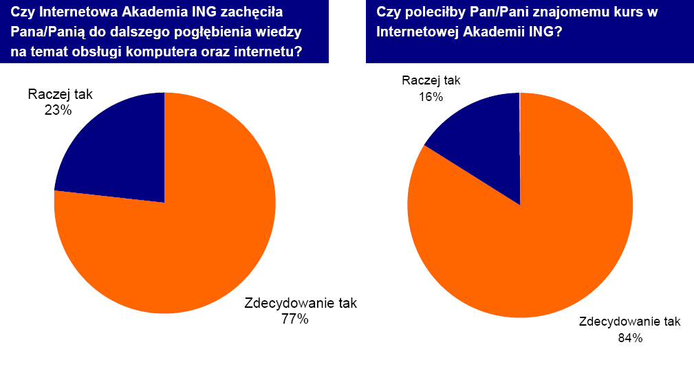 W ankietach przeprowadzonych wśród kursantów, czterech na pięciu uznało, że zajęcia Internetowej Akademii ING zdecydowanie zachęciły ich do pogłębiania wiedzy na temat internetu, a 84% uczestników zdecydowanie poleciłoby je swoim znajomym