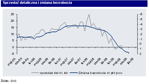 Sprzedaż detaliczna wzrosła o 1.1% w maju, blisko mediany prognoz (0,8) i powyżej naszych oczekiwań (-1). O dziwo ponad 20% rośnie ciągle realnie sprzedaż tekstyliów, tempo spadku sprzedaży samochodów spowolniło z -20 do -10%. Sytuacja na rynku pracy grozi jednak spadkami sprzedaży detalicznej nie pozwoli jednak na utrzymywanie się wzrostu sprzedaży na dodatnim poziomie w najbliższych miesiącach. Choć opublikowane wczoraj bezrobocie zmniejszyło się w maju wobec kwietnia, spadek ten był mały jak na porę roku – roczna zmiana bezrobocia zwiększa się z -1 na początku roku do +0,7 w kwietniu i +1pkt w maju, a jest to prawdopodobnie jedynie początek.