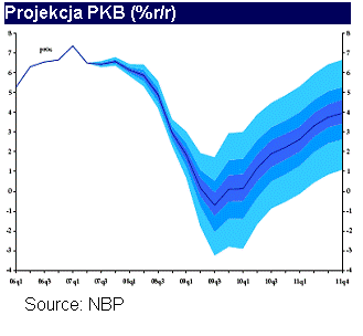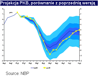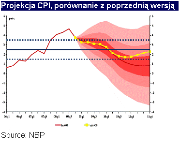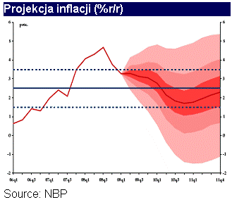 Nowa projekcja inflacji pokazała CPI wewnątrz pasma dopuszczalnych odchyleń od celu w całym obejmowanym analizą okresie. W 2poł10 inflacja zbliżyć się ma do dolnego ograniczenia (1,5%r/r) i to mogło pomóc RPP w podjęciu decyzji o obniżeniu stóp na posiedzeniu w ubiegłym tygodniu, szczególnie gdy projekcja PKB podkreśliła szkodliwość globalnego spowolnienia dla polskiej gospodarki – ścieżka obniżyła się o ok. 1pkt. proc. w niemal całym horyzoncie czasowym, (przecięcie linii jest dopiero w 3kw11).