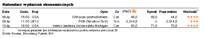 Bez danych w Polsce (ewentualnie wykonanie budżetu za czerwiec). Zagranicą ISM dla sektora usług oraz nastroje konsumentów Michigan.