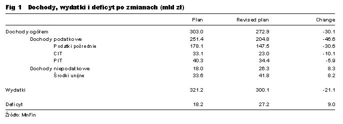 Ministerstwo finansów szacuje ubytek dochodów podatkowych w tym roku na 46,6mld zł w porównaniu do wyjściowego planu. Nasze szacunki (oparte na dotychczasowych wynikach) wskazują na utratę 35-40mld, szacunki ministerstwa są więc stosunkowo konserwatywne.