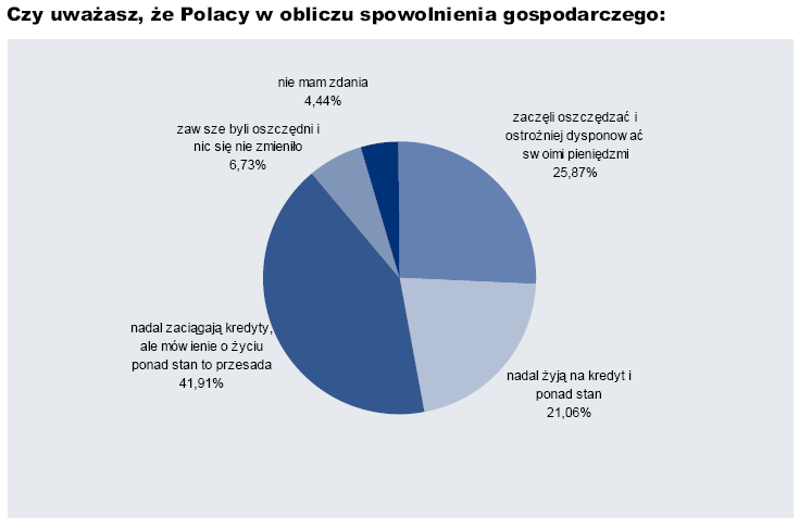 Czy kryzys coś zmienił? Z ankiety ING wynika, że stosunkowo niewiele. Co piąty respondent (21%) uznał, że Polacy faktycznie żyli ponad stan, a co więcej - mimo spowolnienia gospodarczego żyją tak nadal (co nasuwa pytanie jak długo można żyć ponad stan nie doświadczając konsekwencji). Dwóch na pięciu ankietowanych (42%) podziela natomiast pogląd, że polski boom kredytowy nie był wynikiem zaspakajania potrzeby życia ponad stan, a Polacy nadal zaciągają kredyty, bez względu na pogorszenie koniunktury. Byliśmy i jesteśmy nadal oszczędni w oczach zaledwie 7% badanych.