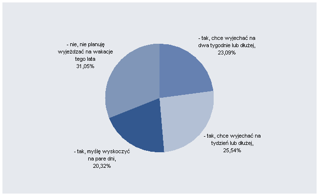 Urlop (letni) wciąż jest luksusem, na który nie stać około 30-40% Polaków (31,05% w pierwszej ankiecie; 38,7% w drugiej). Takie wyniki przedstawiło badanie, które przeprowadziliśmy wśród klientów ING Banku Śląskiego. Pozostałe około 75% ankietowanych, którzy odpoczywają w okresie letnim, wyjeżdża na urlopy kilkudniowe (20,32% ankietowanych), tygodniowe (25,54%) albo dwutygodniowe (23,09%).