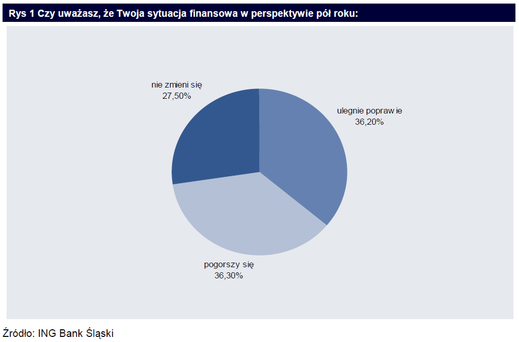 Przeprowadzone przez GUS badanie koniunktury konsumenckiej wykazało, że w październiku 2008 r. różnica między odsetkiem osób spodziewających się poprawy, a odsetkiem zakładających, że ich sytuacja finansowa się pogorszy wyniosła -8,1 pkt. proc, w kwietniu 2009 r. było to -12,9 pkt. proc, a w grudniu 2009 r. -8,8%. W przypadku ankietowanych klientów ING było to natomiast odpowiednio +3,0 pkt. proc., -6,5 pkt. proc. i -0,1 pkt. proc. Wygląda na to, że klienci ING wyróżniają się optymizmem na tle ogólnopolskim (nie upieramy się, że badania nasze i GUS są porównywalne), jednak ważniejsze jest, że oba badania pokazują tą samą tendencję. Ma ona uzasadnienie w sytuacji gospodarczej.