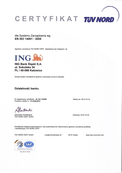ING Bank Śląski wprowadził System Zarządzania Środowiskowego wg międzynarodowej normy ISO 14001. System ten pozwala rozpoznawać wszelkie aspekty działalności banku, które mają lub mogą mieć negatywne skutki na środowisko. Audyt z zakresu procedur i działań ekologicznych pokazuje, że bank spełnia wysokie standardy środowiskowe określone międzynarodową normą.