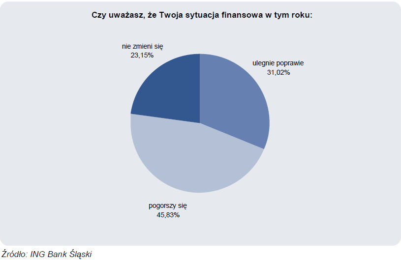 Zapytaliśmy naszych klientów o ich oczekiwania wobec własnej sytuacji finansowej na najbliższy rok. Patrząc na wyniki ankiety ING trudno mówić o pokryzysowej poprawie nastrojów czy porzuceniu „myślenia kryzysowego”. Blisko połowa ankietowanych spodziewa się, że ich sytuacja finansowa w tym roku pogorszy się.