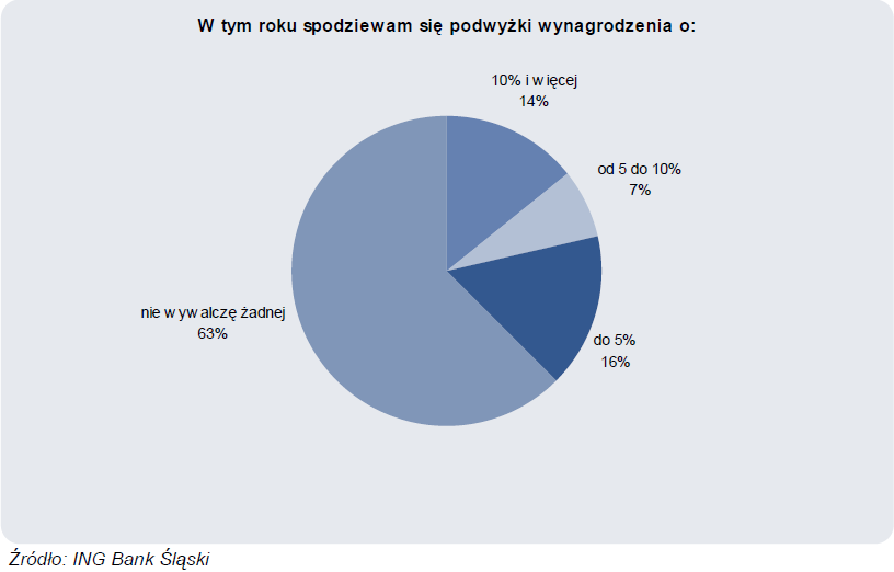 Aby dowiedzieć się więcej o nastrojach Polaków, zadaliśmy naszym klientom dodatkowe pytanie o oczekiwaną podwyżkę wynagrodzenia w tym roku. W sumie realną szansę na podwyższenie pensji widzi 38% respondentów. Z badania koniunktury przeprowadzonego przez NBP wynika, że według planów płacowych przedsiębiorstw w pierwszym kwartale podwyżki mogą objąć 23% pracowników, a większość zmian wynagrodzeń będzie umiarkowana. Porównajmy szacunki NBP z wynikami naszej sondy: w pierwszym kwartale tego roku podwyżkę do 5% pensji może otrzymać 15% pracowników (wg. klientów ING 16%), podwyżkę 5-10% pensji 8% (wg. klientów ING 7%). Odsetki z naszego badania są więc zaskakująco zbieżne ze wskazaniami raportu NBP, jedynie oczekiwania osób myślących o podwyżkach ponad 10%-owych rozbiegają się z obrazem po stronie przedsiębiorstw. Należy zastrzec, ze nasze pytanie dotyczyło oczekiwań na cały rok, a badanie NBP tylko w pierwszym kwartale. Apetyt na podwyżki wyrażany przez naszych klientów oraz hojność pracodawców mogą ulec zmianie, jeśli utrzymywać się będzie dobra koniunktura. Nie bez znaczenia może być także otwarcie niemieckiego rynku pracy w maju tego roku.