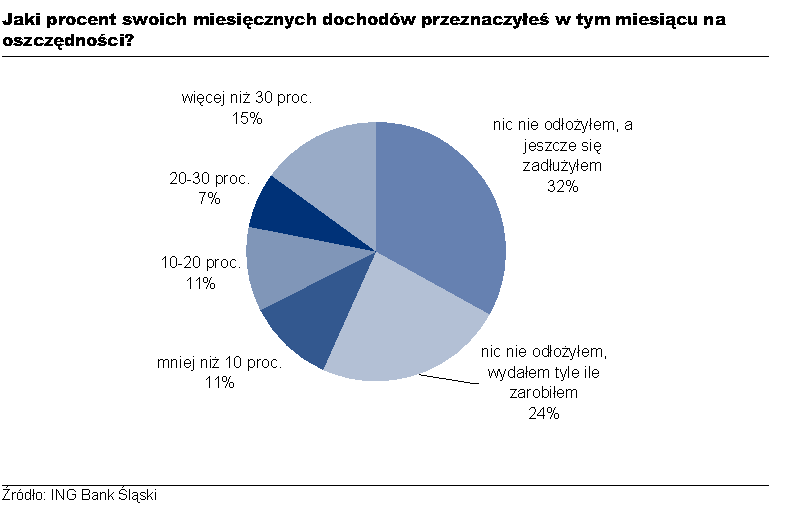 Nasza sonda, przeprowadzona wśród użytkowników INGBankOnline wskazała, że odsetek osób, którym w ostatnim miesiącu udało się odłożyć coś z pensji wyniósł 43%. 33% nie tylko nic nie odłożyło, ale jeszcze musiało sięgnąć po zewnętrzne finansowanie. Tę sondę traktujemy jako bilans otwarcia. W ciągu roku będziemy zadawać pytania z zakresu gospodarowania pieniędzmi, motywów oszczędzania i wydawania, źródeł oporu przed pierwszym krokiem w oszczędzaniu. Kryzys (po początkowej próbie ratowania poziomu konsumpcji przez gospodarstwa domowe kosztem odkładania na przyszłość) sprzyjał poprawie skłonności do oszczędzania. Potwierdzają to dane GUS o dochodach gospodarstw domowych. Co więcej, naszym zdaniem nie wróci w tym roku wzmożona konsumpcja (czasami określana jako „życie ponad stan”), która towarzyszyła nam w drugiej połowie 2007 i 2008 roku do czasu wybuchu globalnego kryzysu kredytowego. 2011 będzie więc dobrym rokiem do wyrobienia w sobie nawyku oszczędzania. Poprawa koniunktury rodząca nowe miejsca pracy, powinna też pomóc w oszczędzaniu tym, którzy nawyk i motywację mają, ale brakuje im na tyle dobrego źródła dochodu, żeby było z czego odkładać.