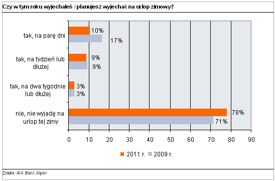 Blisko czterech na pięciu (78%) klientów ING Banku Śląskiego przyznało, że nie wyjechało lub nie planuje w tym roku wyjechać na urlop zimowy. Gdy to samo pytanie zadaliśmy dwa lata temu, ferie w domu zamierzało spędzić 71% ankietowanych. Największa zmiana nastąpiła w kategorii „wyjadę na parę dni” - odsetek respondentów wybierających tą odpowiedź zmniejszył się o ponad jedną trzecią, z 17% do 10%. W przypadku dłuższych wyjazdów wyniki były podobne.