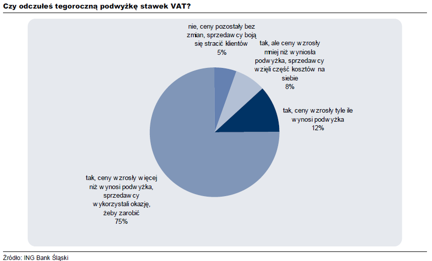 Według badania przedsiębiorstw za 4 kwartał ub.r., przeprowadzonego przez NBP, ponad połowa firm zadeklarowała całkowite lub częściowe przeniesienie zmiany VAT (i jej kosztów) na klientów. Równocześnie połowa przedsiębiorstw, które zadeklarowały, że nie przeniosą wzrostu stawek VAT na swoje ceny, przyznało, że zamierza przeprowadzić podwyżki z innych powodów. Faktyczna zmiana cen w styczniu w porównaniu z grudniem wyniosła 1,2%. Żywność i napoje bezalkoholowe podrożały o 1,7%, ale w kategorii „wyposażenie mieszkania i prowadzenie gospodarstwa domowego” ceny wzrosły o 0,6%. Odzież i obuwie potaniały o 2,5%.
