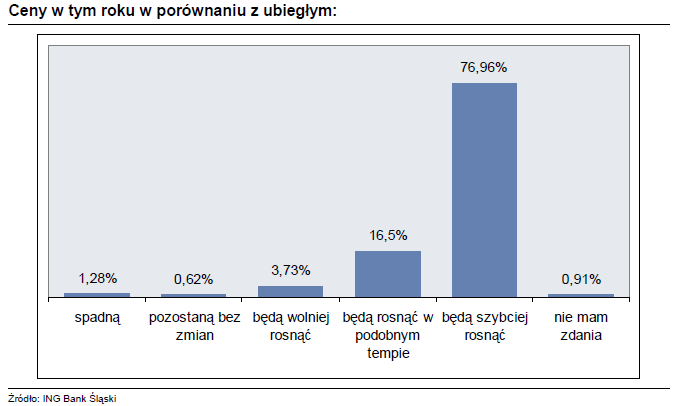 W naszej cotygodniowej ankiecie poprosiliśmy klientów ING Banku Śląskiego o prognozę przyszłego zachowania się cen. Wyniki naszej sondy wskazują na większe poczucie zagrożenia wzrostem inflacji niż sugerują podobne badania.