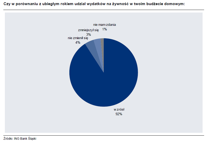 Dziewięć na dziesięć osób, które wzięło udział w naszej ankiecie stwierdziło, że w porównaniu z ubiegłym rokiem udział wydatków na żywność w ich budżecie domowym wzrósł. To oznacza, że mniejsza część dochodu niż w ubiegłym roku zostaje im na pozostałe zakupy. Jeśli ceny żywności zaczną gwałtownie rosnąć, to wydatki na produkty spożywcze ograniczą pozostałą konsumpcję do tego stopnia, że zaszkodzi to całej gospodarce. Ale przecież z jedzenia nie da się zrezygnować. Chociaż…
