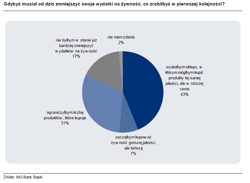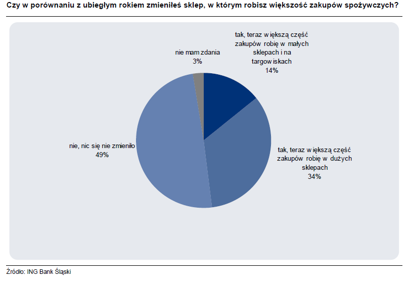 Tym razem klientom ING zadaliśmy trzy pytania. Chcieliśmy się dowiedzieć czy w porównaniu z ubiegłym rokiem wydają więcej pieniędzy na zakupy spożywcze co zrobiliby, gdyby musieli zmniejszyć wydatki na żywność oraz w jakich sklepach najczęściej robią zakupy.