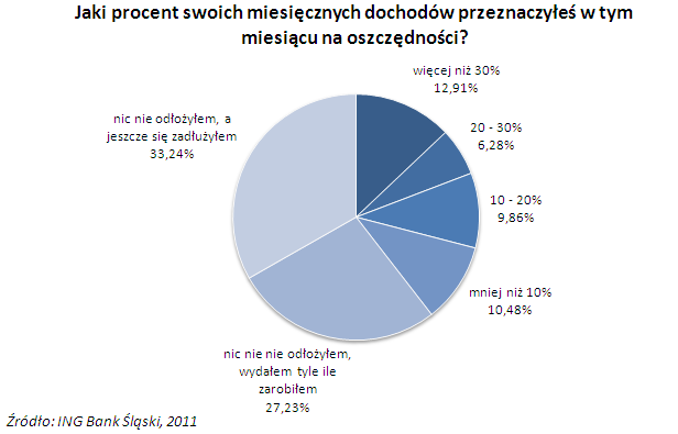Odsetek osób, którym w kwietniu udało się przeznaczyć część miesięcznych dochodów na oszczędności wyniósł 40% i od stycznia br. zmalał o 3%. Podobnie jak na początku roku, pensja (lub inny dochód) co trzeciej osoby nie starczyła na pokrycie bieżących wydatków. Przyrost odsetka osób, które wydały tyle pieniędzy, ile zarobiły, był niemal równy spadkowi odsetka osób, którym coś się jednak udało odłożyć.