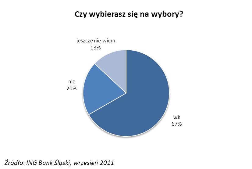 Czy wynik nadchodzący wyborów zadecyduje o sytuacji gospodarczej Polski w najbliższych latach? Połowa osób, które wzięły udział w ankiecie ING uważa, że z punktu widzenia gospodarki jest istotne, kto będzie rządził Polską przez najbliższe cztery lata (50%). Odmiennego zdania było 46% respondentów - ich zdaniem wynik wyborów nie wpłynie znacząco na gospodarkę. Czy to oznacza, że do urn pójdzie, jak zwykle z resztą, tylko połowa Polaków? Wyniki naszej ankiety są wyjątkowo optymistyczne - 67% respondentów zadeklarowało swój udział w wyborach. 13% ankietowanych jeszcze nie zdecydowało, czy będzie głosować.