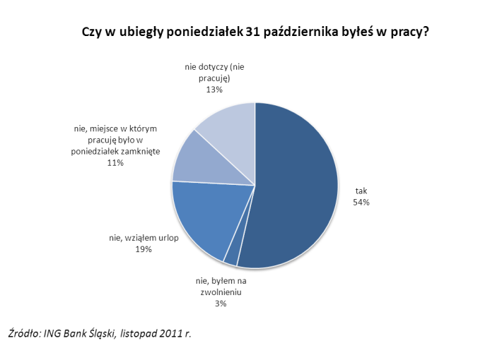 Wiele osób idąc do pracy w ostatni dzień października miało wrażenie, że był to dzień wolny. Wyludnione ulice, świąteczne rozkłady jazdy komunikacji miejskiej. Również ankieta ING uchwyciła obniżoną frekwencję w pracy, która nie pozostaje bez znaczenia dla wyników odnotowywanych przez gospodarkę.