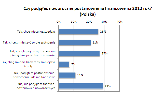 Polska zajęła 8 miejsce na 17 badanych krajów pod względem liczby osób, które podjęły postanowienia finansowe na nadchodzący rok. Najwięcej osób deklaruje podjęcie finansowych postanowień noworocznych w Rumunii (91%), Turcji (89%) oraz Indiach (86%), a najmniej w Wielkiej Brytanii (40%), Holandii (41%) oraz Niemczech (42%).