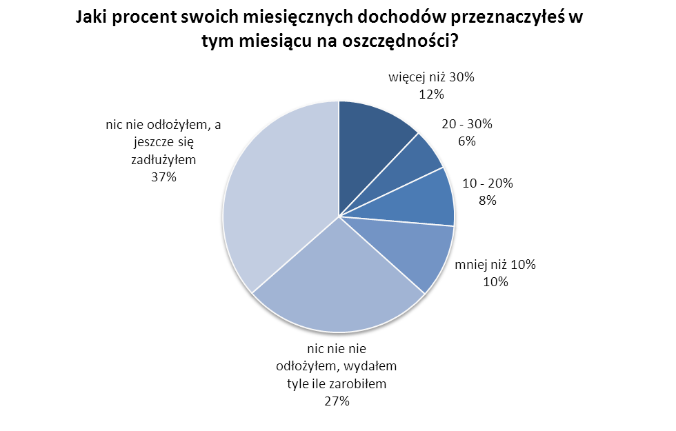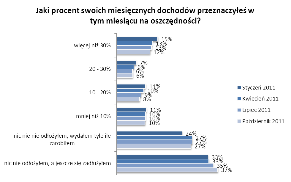 Pod koniec października tego roku odsetek osób, którym udało się przeznaczyć część swoich miesięcznych dochodów na oszczędności spadł do poziomu 37% - w lipcu wynosił on jeszcze 38%, a w styczniu aż 43%. Odsetek tych, którzy wiążą koniec z końcem, ale na oszczędzanie już sobie pozwolić nie mogą utrzymał się na poziomie 27%. Przybyło natomiast osób, których dochody nie starczają do zaspokojenia bieżących potrzeb – w październiku było to 37% respondentów, w lipcu jeszcze 35%, a na początku roku 33%.
