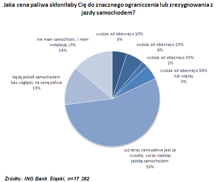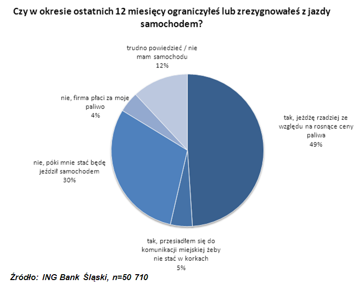 Z powodu rosnących cen paliw, 58% kierowców jeżdżących prywatnymi samochodami przyznało, że w okresie ostatnich 12 miesięcy ograniczyło jazdę samochodem. Co dwudziesty (5%) przesiadł się na komunikację miejską, a co trzeci (36%) nie zareagował na wzrost cen paliw i zamierza jeździć samochodem tak długo jak będzie go na to stać.