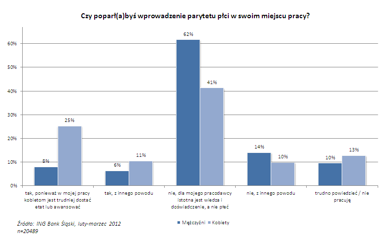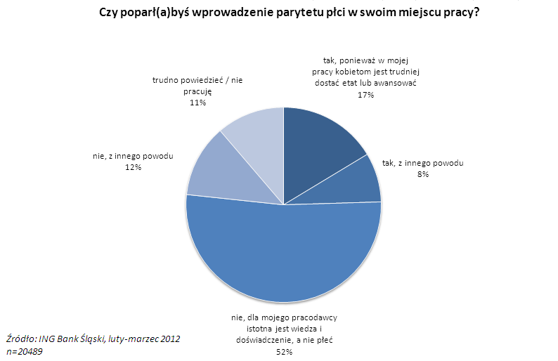 Zwolennicy wprowadzenia parytetu płci w zakładach pracy pozostają w mniejszości - tylko co czwarty ankietowany (25%) poparłby takie regulacje. Przeciwne temu rozwiązaniu było dwie trzecie osób (64%), które wzięły udział w ankiecie ING. Różnica zdań pomiędzy zwolennikami i przeciwnikami parytetów skoncentrowała się na zagadnieniu roli płci podczas rekrutacji i decyzji o awansach. Zdaniem 16% badanych potrzebne są działania na rzecz wyrównania szans w tym zakresie w ich miejscu pracy. Zdecydowana większość ankietowanych (52%) uważa jednak, że ingerencja regulatora w decyzje kadrowe byłaby nieuzasadniona, bo w miejscu w którym pracują liczy się wiedza i i doświadczenie, a nie płeć.