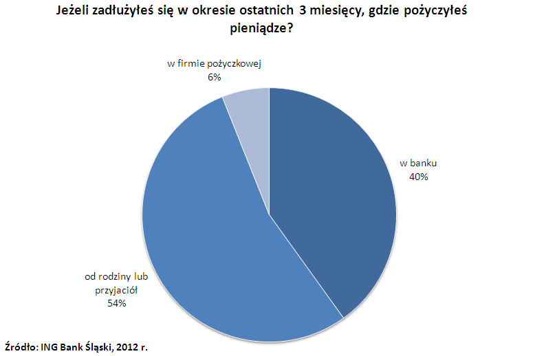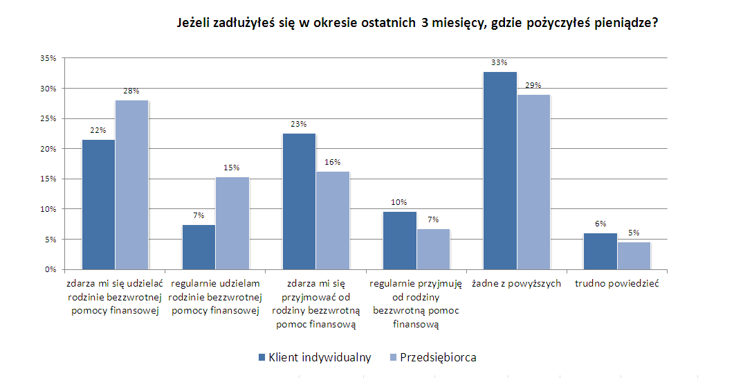 Z ankiety ING wynika, że w styczniu tego roku jedna trzecia respondentów (32%) musiała się zapożyczyć, aby pokryć swoje bieżące wydatki - zbliżone wyniki uzyskaliśmy w poprzednich kwartałach. Gdy w oddzielnej sondzie zapytaliśmy gdzie respondenci się zadłużyli, 40% wskazało na banki, a ponad połowa (54%) przyznała, że otrzymała pieniądze od rodziny lub przyjaciół. Jak podejrzewamy, respondenci mieli na myśli nie tyle „komercyjne” pożyczki od najbliższych, co transfery środków – czyli pomoc, która być może nigdy nie zostanie zwrócona. Wyniki ankiety dotyczącej udzielania i przyjmowania pomocy od rodziny zdają się potwierdzać naszą hipotezę.