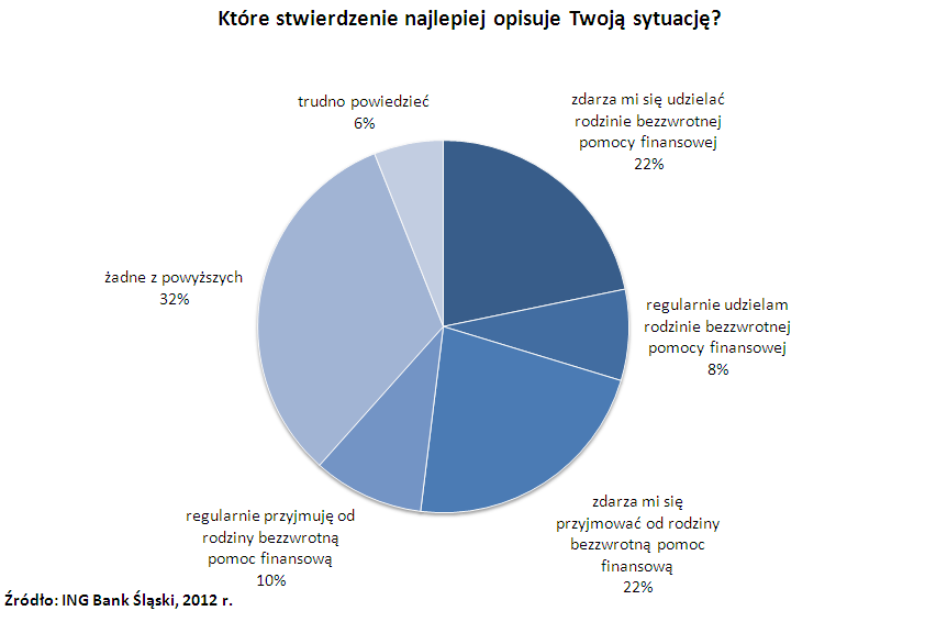 Do udzielania rodzinie bezzwrotnej pomocy finansowej przyznał się blisko co trzeci badany – z czego 22% osób zadeklarowało, że pomaga najbliższym sporadycznie, a 8% regularnie. Odsetek osób udzielających pomocy niemal pokrył się z udziałem respondentów otrzymujących wsparcie (w sumie 32%). Co trzecia osoba biorąca udział w ankiecie ING, nie udziela, ani nie otrzymuje wsparcia od najbliższych.
