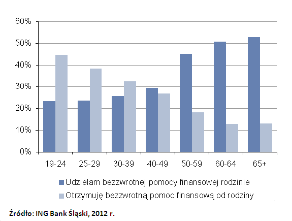 Wraz z wiekiem rośnie odsetek osób udzielających pomocy, a maleje otrzymujących wsparcie. Także w najwyższym przedziale wiekowym (65 lat i więcej) nie widać wzrostu wskazań na otrzymywanie transferów od rodziny. Kobiety nieco częściej mówiły o otrzymywaniu pomocy od rodziny (35%) niż mężczyźni (30%).