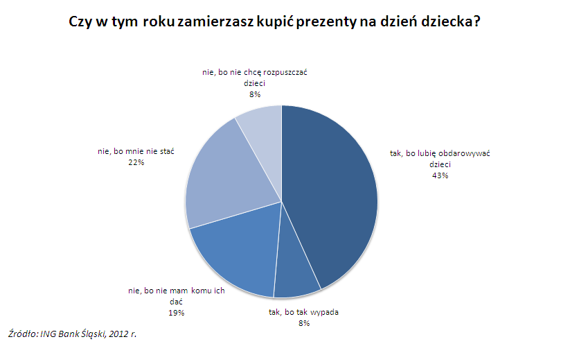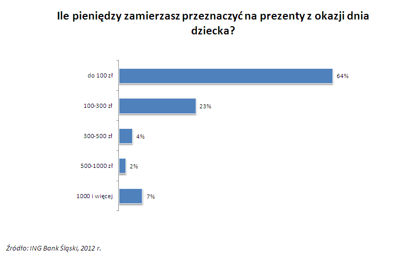 W ankiecie ING zapytaliśmy naszych klientów, czy zamierzają kupić prezenty na Dzień Dziecka. Jeżeli pominiemy osoby, które nie mają kogo obdarować z okazji 1 czerwca, większość ankietowanych odpowiedziała pozytywnie (63%). Wśród nich czterech na pięciu respondentów uzasadniło zakup prezentów przyjemnością obdarowywania dzieci (84%). Pozostali zadeklarowali że „tak wypada” (16%). Z kolei osoby, które nie kupią prezentów uzasadniały to przede wszystkim brakiem pieniędzy (73%), a rzadziej wskazywały na to, że nie chcą rozpuszczać dzieci (27%).