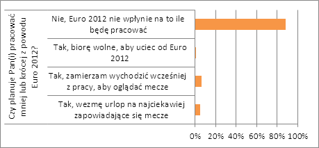 W przypadku 88% respondentów mistrzostwa nie wpłyną na to ile będą pracować. Z tego powodu tylko 5% osób chce wziąć urlop, a zaledwie 6% planuje wcześniej wychodzić z pracy. Jeśli jednak pod uwagę weźmiemy płeć uczestników badania, to okazuje się, że ze względu na mecze swój czas pracy skróci 16% mężczyzn i tylko 7% kobiet. Jeden na stu respondentów weźmie urlop, żeby uciec przed zamieszaniem związanym z rozgrywkami.