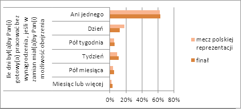 Autorzy badania postanowili również sprawdzić, ile dni Polscy kibice są w stanie pracować bez wynagrodzenia, jeśli w zamian mogliby zobaczyć na żywo mecz polskiej reprezentacji oraz finał. W obu przypadkach ponad 60% respondentów nie przepracowałoby za darmo nawet jednego dnia, aby zobaczyć mecz na żywo. Jednodniowy zarobek w zamian za mecz naszej reprezentacji byłoby skłonne poświęcić 18% respondentów, a w zamian za finał tylko 12%.