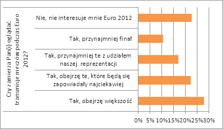 Wśród 77% respondentów deklarujących, że będą oglądać mistrzostwa w telewizji znalazły się zarówno osoby, które chcą zobaczyć tylko finał (10%), najciekawsze mecze (22%) oraz rozgrywki z udziałem reprezentacji narodowej (17%). Ponad jedna czwarta Polaków (28%) deklaruje chęć oglądania większości meczów, a brak zainteresowania transmisjami mistrzostw podkreśla prawie jedna czwarta (23%) respondentów.