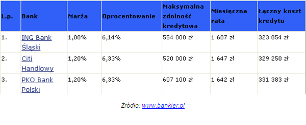 Zgodnie z rankingiem Bankier.pl, ING Bank Śląski oferuje najkorzystniejszy kredyt hipoteczny z wkładem własnym w wysokości 20%. Z wyliczeń portalu wynika, że ING oferuje najlepsze warunki kredytowania, z niską marżą na poziomie 1%. Zestawienie przygotowano dla kredytu w kwocie 264 tys zł, z okresem kredytowania wynoszącym 360 miesięcy, przy LTV na poziomie 80%. Łączny koszt kredytu hipotecznego w ING Banku Śląskim wynosi 323 054 tys. zł, a miesięczna rata dla tej kwoty wynosi 1 607 zł.
