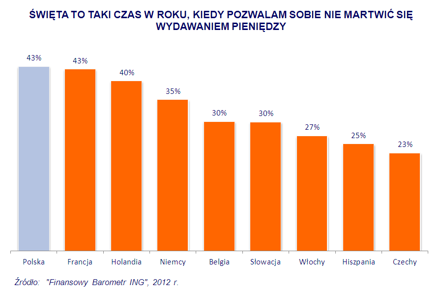 Z międzynarodowego badania ING wynika, że dla 43% Polaków święta Bożego Narodzenia to czas, w którym nie martwią się o to, ile wydadzą. To najwyższy wynik w Europie - średnia w pozostałych krajach wyniosła 33%. Polska znalazła się także w europejskiej czołówce krajów, pod względem odsetka mieszkańców, którzy planują wydać na Święta więcej niż rok temu. Choć z wynikiem 22% daleko nam do Holandii, gdzie 34% respondentów zamierza przeznaczyć na świąteczne wydatki więcej środków niż w ubiegłym roku, to i tak wyróżniamy się na tle pozostałych krajów (w tym Niemiec), w których odsetek waha się między 8 a 11% (z wyjątkiem Hiszpanii z 18%).