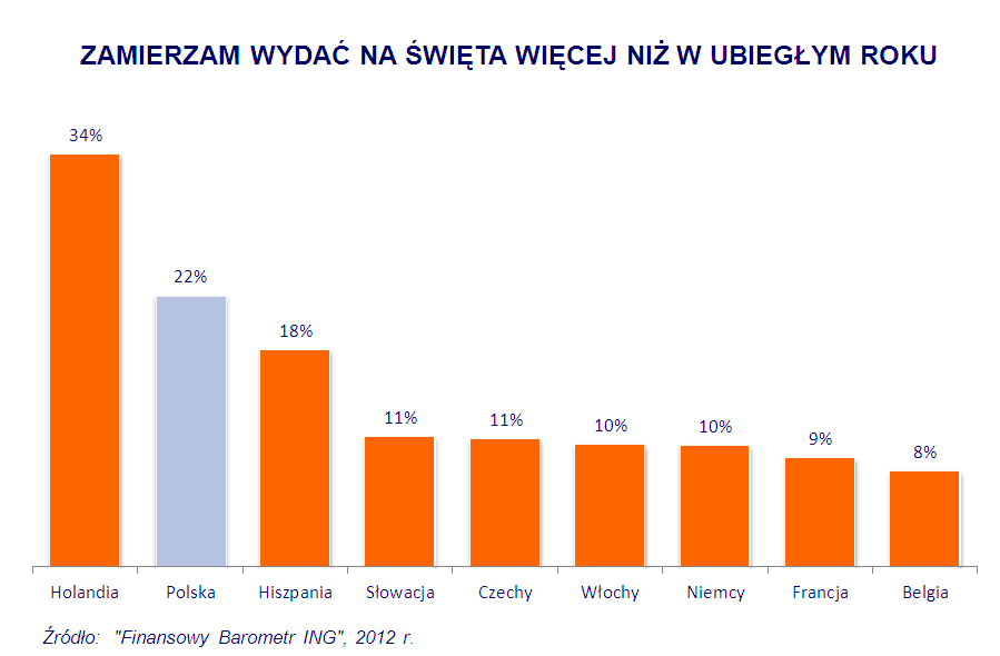 - 22% Polaków planuje wydać w nadchodzące święta Bożego Narodzenia więcej niż rok temu. To drugi najwyższy odsetek uzyskany w badaniu, po Holandii (34%). Za Polakami znaleźli się m.in. Niemcy (10%), Francuzi (9%) oraz Belgowie (8%)