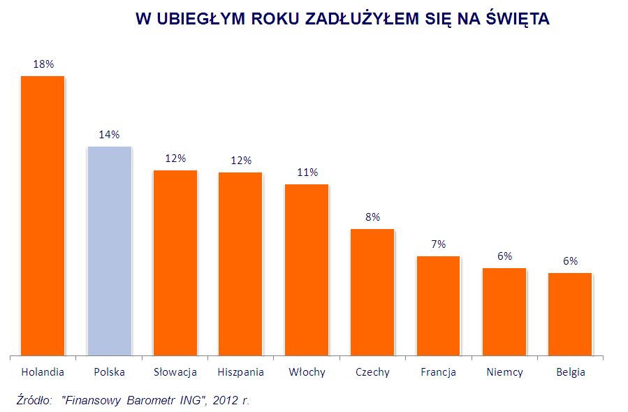 - 14% Polaków zaciągnęło w ubiegłym roku kredyt na Święta. To drugi najwyższy wynik po Holandii (18%). Najmniej skłonni do zaciągania kredytu na Święta byli Niemcy i Belgowie (6%)