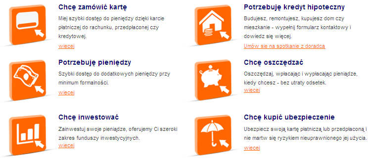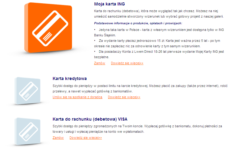 „Oferta na klik” to nowa sekcja ING BankOnLine, która w jednym miejscu gromadzi propozycje produktowe dostępne dla użytkowników systemu. Dzięki wprowadzeniu przejrzystego podziału oferty banku według grup potrzeb, klienci mogą szybciej i wygodniej dokonywać zakupu interesujących ich produktów i usług. Na stronie po kilku „kliknięciach” można m.in. otworzyć rachunek rozliczeniowy lub oszczędnościowy, zamówić kartę płatniczą lub kredytową, złożyć wniosek o pożyczkę gotówkową którą można uzyskać online, a także poprosić o kontakt w sprawie oferty hipotecznej.