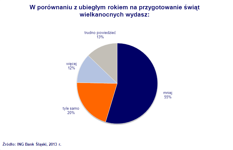 Odpowiedzią na pytanie dlaczego efekt świąt nie wystąpił może być nasza ankieta na temat wydatków świątecznych, przeprowadzona wśród klientów ING Banku Śląskiego. Tylko co piąta osoba zadeklarowała, że wyda na przygotowania tyle samo co rok wcześniej (20%). Ponad połowa przyznała, że świętować będzie z zaciśniętym pasem (55%). Dla porównania, gdy zadaliśmy to samo pytanie przed ubiegłorocznymi świętami Bożego Narodzenia, aż 40% respondentów zadeklarowała ograniczenie wydatków względem 2011. Sporu nad wyższością świąt może ten wynik nie rozstrzyga, ale utwierdza nas w przekonaniu, że gospodarstwa domowe pod względem sytuacji finansowej jeszcze nie wyszły na prostą.
