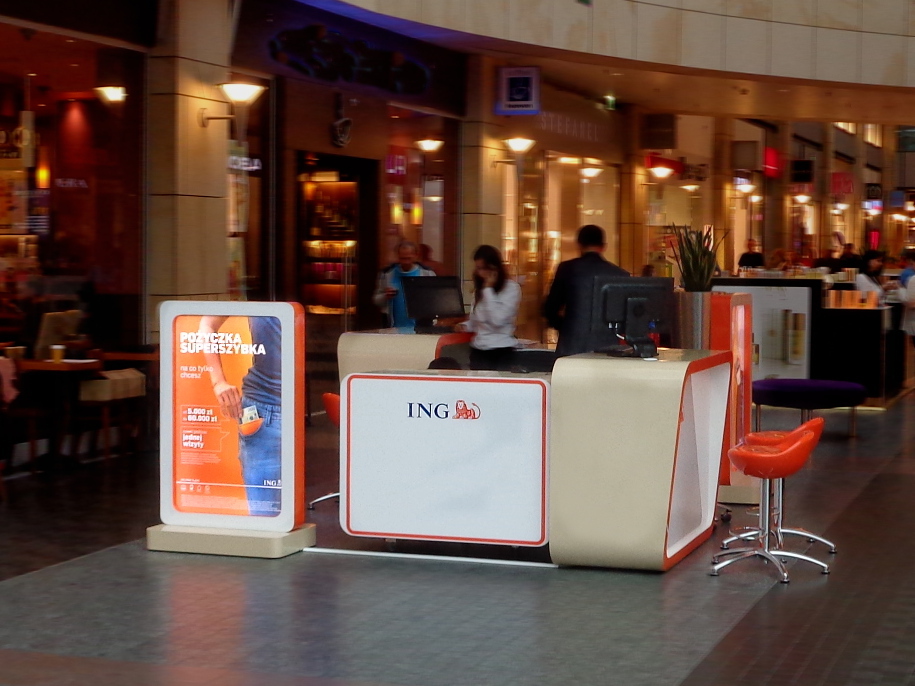 Stoiska ING Banku Śląskiego zostały ulokowane w popularnych centrach handlowych w Warszawie, Wrocławiu, Łodzi i Krakowie. W placówkach dostępna jest pełna oferta pożyczkowa oraz rachunków bieżących. Najważniejszą cechą stoisk ING jest ekspresowa obsługa - aby wziąć pożyczkę wystarczy nawet jedna wizyta, o ile klient posiada ze sobą ważny dokument tożsamości i dokumenty potwierdzające dochody.