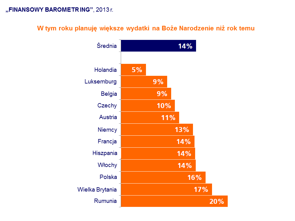 Osoby, które przed rokiem sfinansowały Święta bez zadłużania się, podeszły do tegorocznych wydatków ostrożniej – jedynie co dziesiąta zadeklarowała zwiększenie wydatków w stosunku do 2012 roku. Większe wydatki planowało przeciętnie 14% Europejczyków. W Polsce ten odsetek wyniósł 16%, choć jeszcze rok temu tak odpowiedziało 22% Polaków.