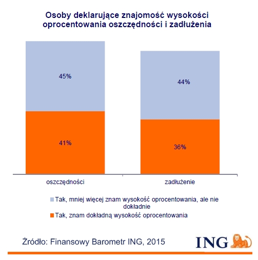 Z badania „Finansowy Barometr ING” wynika, że 86% Polaków deklaruje znajomość wysokości oprocentowania swoich oszczędności. To jeden z najwyższych wyników uzyskanych w badaniu. Dla porównania, taką wiedzą może pochwalić się tylko 71% Belgów. Równocześnie 80% Polaków deklaruje, że wie jaka jest wysokość oprocentowania ich zadłużenia.