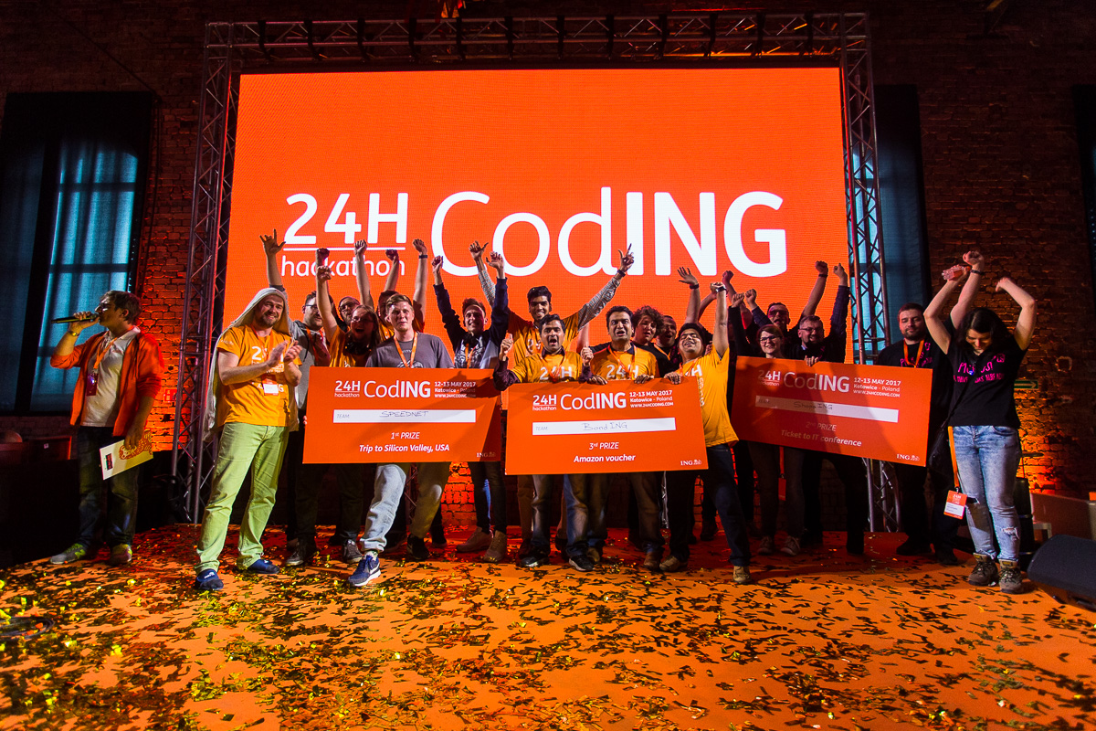 Hackaton 24H-CodING w Katowicach wygrała drużyna Speednet z Trójmiasta, która przygotowała aplikację PubbING. Umożliwia ona rezerwację miejsca i złożenie zamówienia w pubie lub restauracji przed przybyciem na miejsce oraz mobilną płatność bez sięgania do portfela czy proszenia kelnera do stolika. Programiści ze Speednet w nagrodę polecą do Doliny Krzemowej. Na podium znalazły się także drużyna ShoppING, która zaprezentowała aplikację na telefon ułatwiającą codzienne zakupy oraz zespól BondING, który w swoim rozwiązaniu połączył głosową asystentkę Alexę z kontami bankowymi. Najciekawsze pomysły powstałe podczas hackathonu, jeśli będą miały wartość biznesową, mają szansę na rozwinięcie we współpracy z ING.