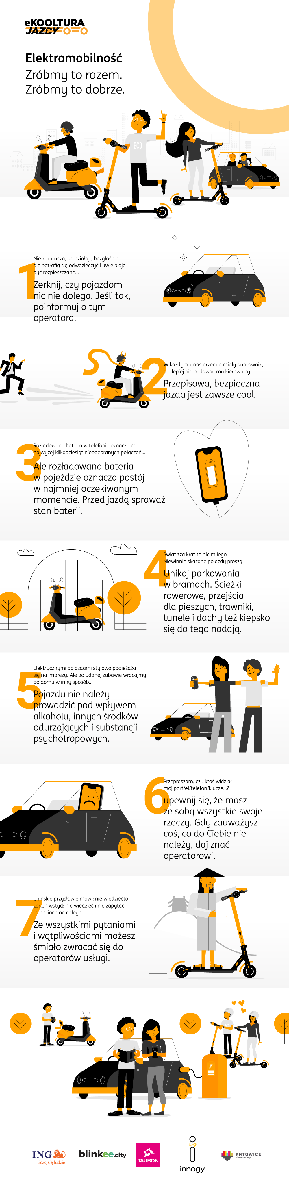 Temat idealnie przybliża ekooltura jazdy – swego rodzaju kodeks, stworzony wspólnie przez Urząd Miasta Katowice, ING Bank Śląski, TAURON, blinkee.city oraz innogy. Wszystkie podmioty aktywnie działają w obszarach elektromobilności i sharingu pojazdów i mają duże doświadczenie w tym temacie.